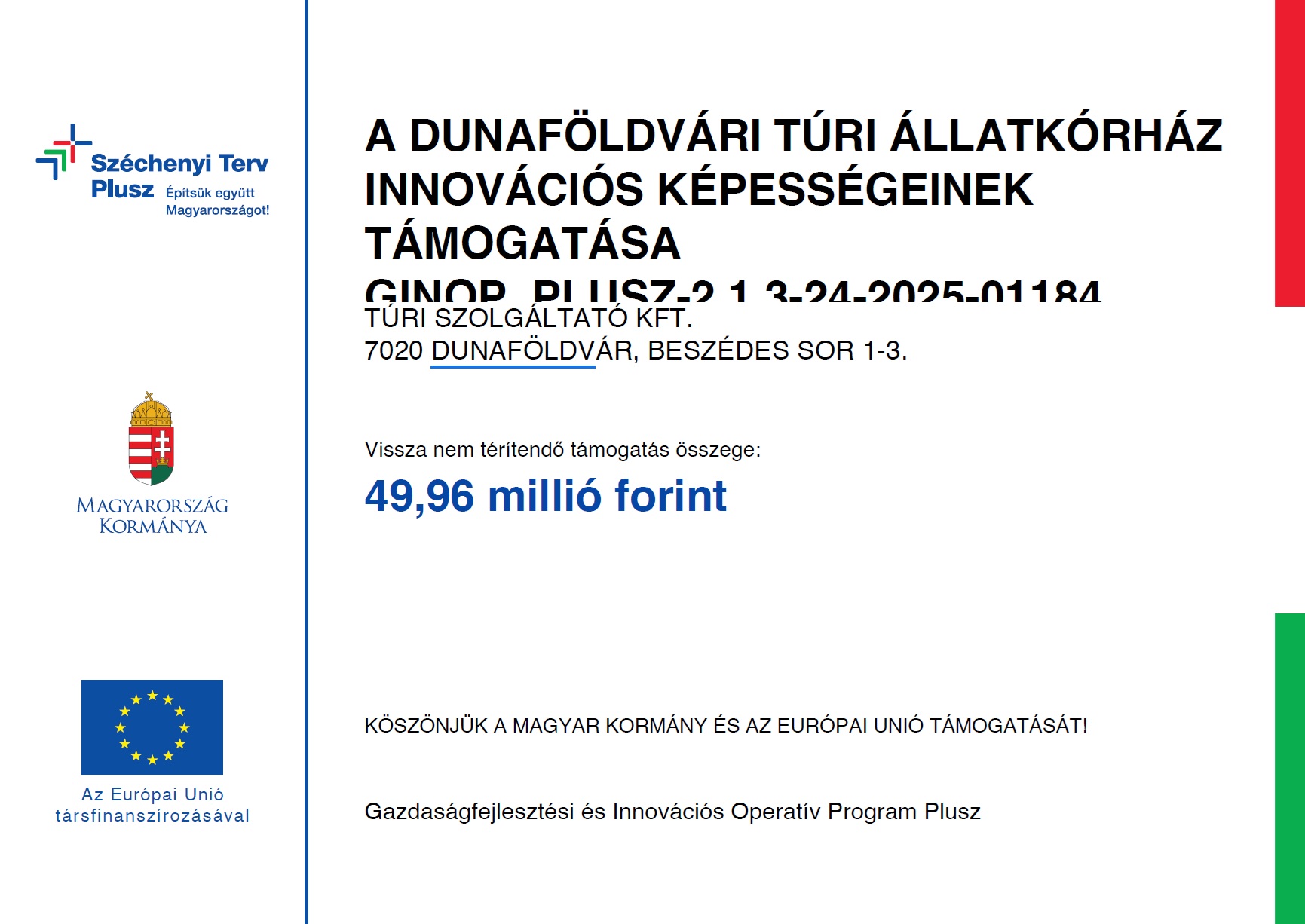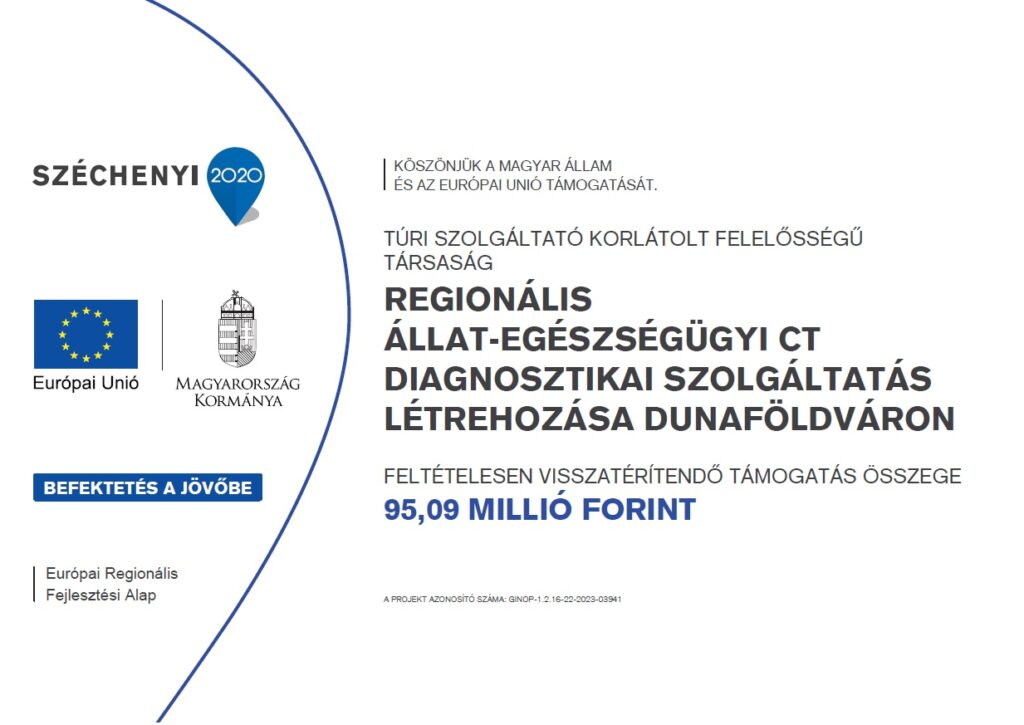 | Projekt megnevezése: | Regionális állat-egészségügyi CT diagnosztikai szolgáltatás létrehozása Dunaföldváron a Túri állatkórházban |